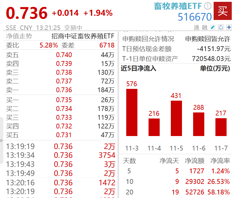 低费率“养猪ETF”——畜牧养殖ETF(516670)涨1.94%,成交超4300万元,较前一日显著放量。行情数据显示,截至11月7日,近5个交易日获资金连续净流入超1700万元;近10个交易日获资金净流入合计2.93亿元。