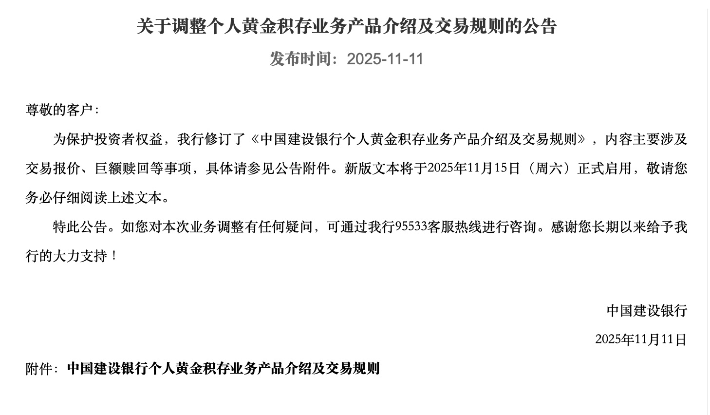 同日,中国建设银行也发布公告称,为保护投资者权益,该行修订了《中国建设银行个人黄金积存业务产品介绍及交易规则》,内容主要涉及交易报价、巨额赎回等事项。新版文本将于2025年11月15日(周六)正式启用。其中,有关黄金积存计划的日积存起点金额由此前的1000元上调为1200元。