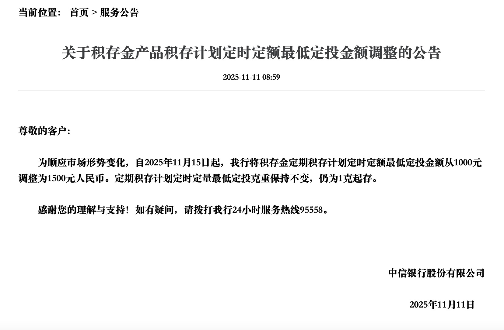 11月11日,中信银行发布公告称,为顺应市场形势变化,自2025年11月15日起,该行将积存金定期积存计划定时定额最低定投金额从1000元调整为1500元人民币。定期积存计划定时定量最低定投克重保持不变,仍为1克起存。