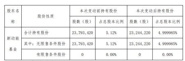 信息披露义务人无锡高新区新动能产业发展基金于2025年11月11日通过集中竞价方式累计减持54.92万股,持股比例由5.12%下降至4.999985%。