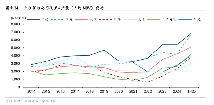 而上市险企代理人产能存在较大差异。据华泰研究统计,在几大上市险企中,中国平安的代理人产能(人均NBV)表现居行业前列。