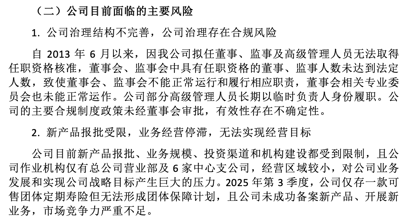 对此,华汇人寿表示,公司目前面临的主要风险是“治理结构不完善,存在合规风险;新产品报批受限,业务经营停滞,无法实现经营目标。”