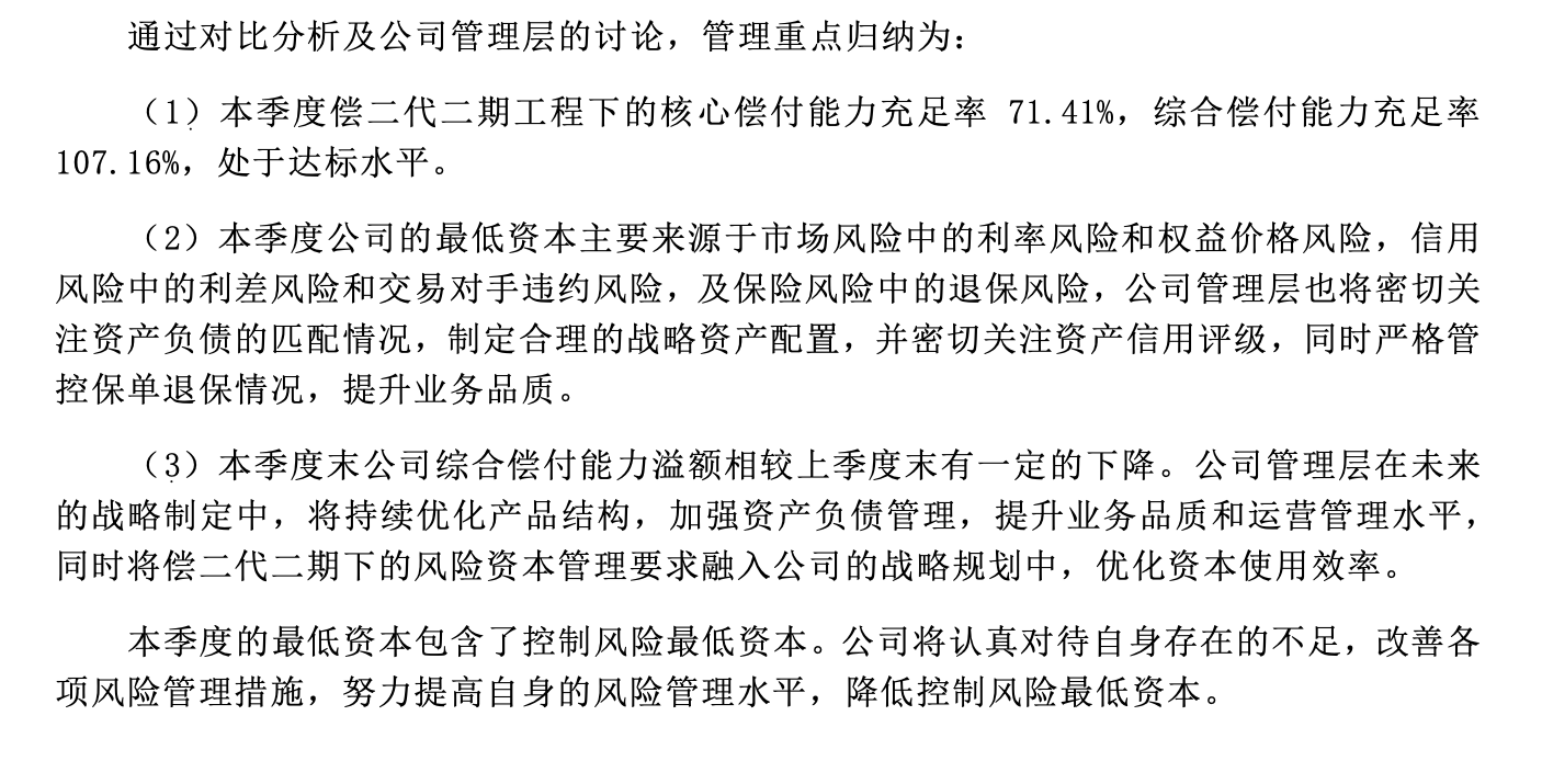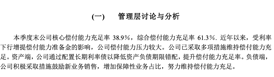 而北大方正第三季度的核心和综合偿付能力充足率分别为71.41%、107.16%,上季度的这一数据分别为95.42%、127.78%。对此,北大方正人寿表示,“管理层在未来的战略制定中,将持续优化产品结构,加强资产负债管理,提升业务品质和运营管理水平。”
