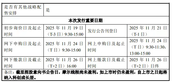 11月13日,摩尔线程在上交所披露科创板上市招股意向书,发行人股票简称为“摩尔线程”,扩位简称为“摩尔线程”,股票代码为“688795”,该代码同时适用于本次发行的初步询价及网下申购。首次公开发行股票初步询价日为2025年11月19日,申购日为11月24日。