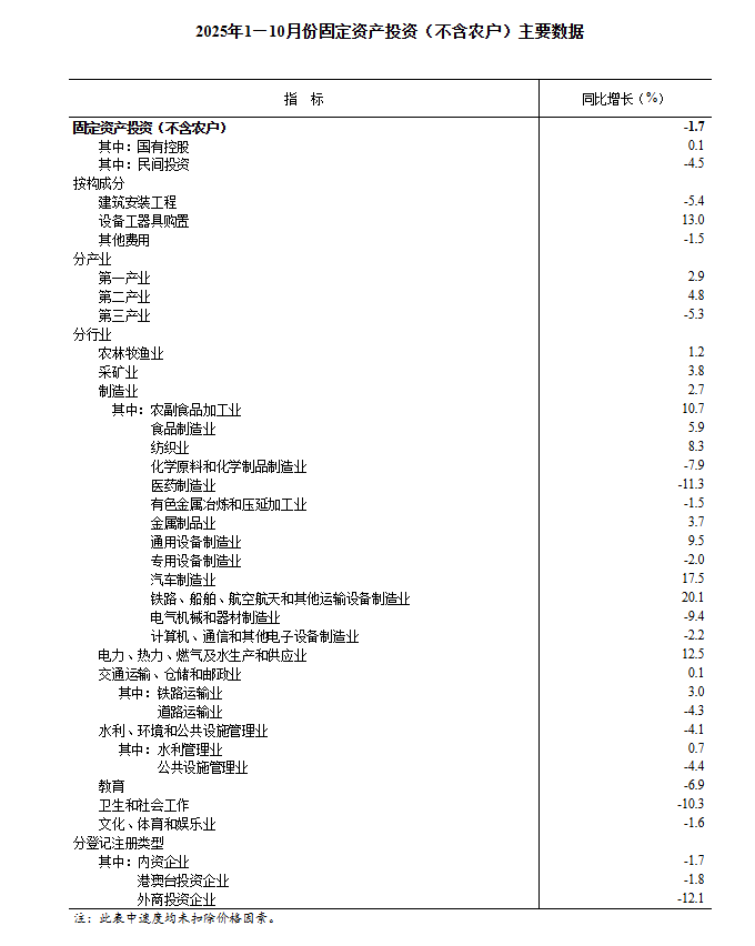 11月14日,国家统计局发布2025年1~10月份全国固定资产投资基本情况,2025年1~10月份,全国固定资产投资(不含农户)408914亿元,同比下降1.7%。其中,民间固定资产投资同比下降4.5%。从环比看,10月份固定资产投资(不含农户)下降1.62%。