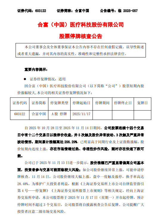 11月14日,合富中国(603122.SH)公告称,自2025年10月28日至2025年11月14日期间,公司股票连续十四个交易日中有十二个交易日以涨停价收盘,并5次触及股价异常波动、3次触及严重异常波动情形,期间累计涨幅高达256.29%,已明显高于同期行业及上证指数涨幅。股价短期内连续上涨,存在市场情绪过热、非理性炒作风险,随时存在快速下跌可能。