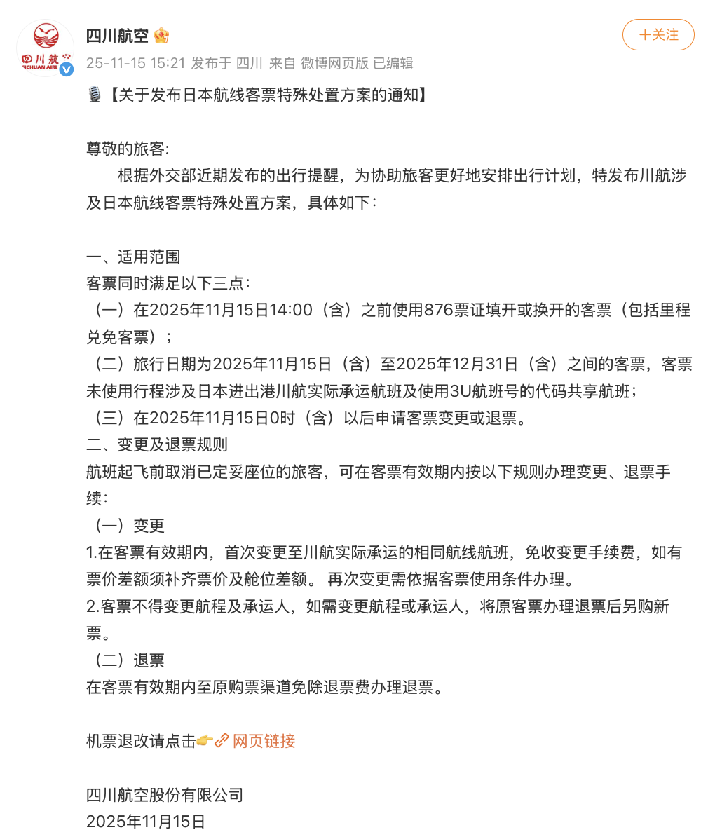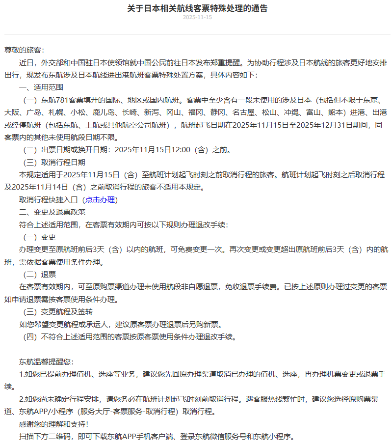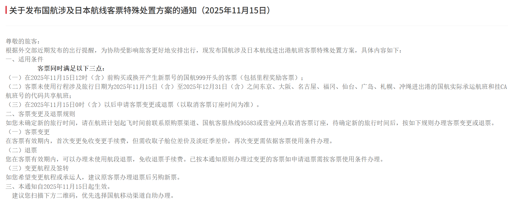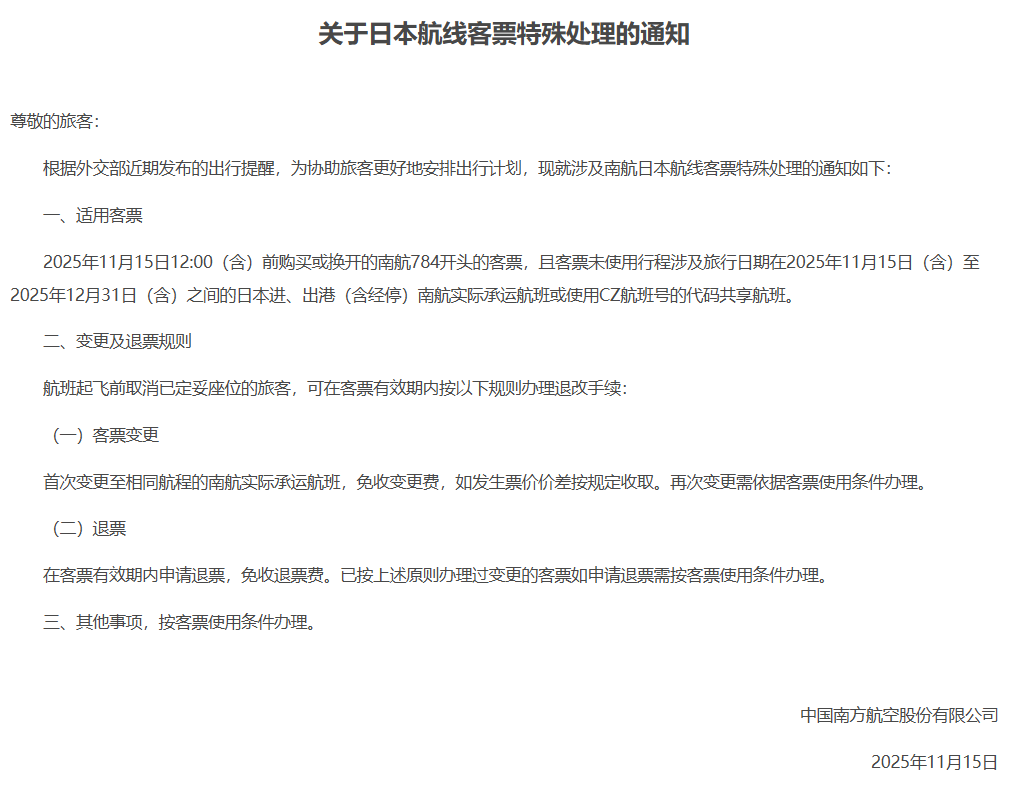 11月15日,中国南方航空股份有限公司、中国国际航空股份有限公司、中国东方航空股份有限公司、海南航空控股股份有限公司、四川航空股份有限公司分别发布了“关于日本航线客票特殊处理的通知”,对于出行日期在12月31日前且符合条件的涉日航线机票,可予以免费退改处理,通知自11月15日起生效。