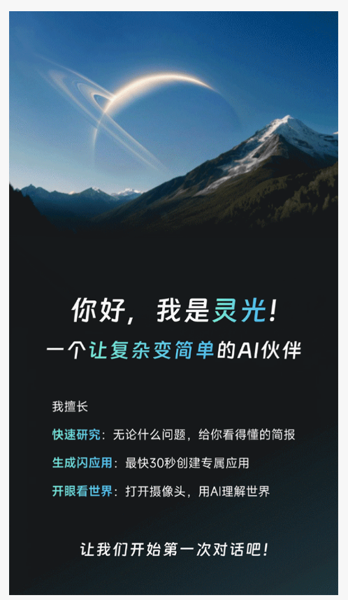 据介绍,“灵光”首批上线三大功能“灵光对话”“灵光闪应用”“灵光开眼”,目前已同步登录安卓与苹果应用商店。
