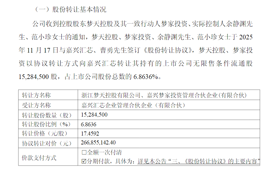 据梦天家居11月18日披露,公司实控人余静渊等与嘉兴汇芯企业管理合伙企业(有限合伙)(以下简称“嘉兴汇芯”)及其实际控制人曹勇签订《股份转让协议》,余静渊等拟合计向受嘉兴汇芯转让其持有的上市公司无限售条件流通股15,284,500股,占上市公司股份总数的6.8636%。转让价格为17.4592元/股,协议转让对价2.67亿元。本次权益变动不会导致公司控股股东及实际控制人发生变化。