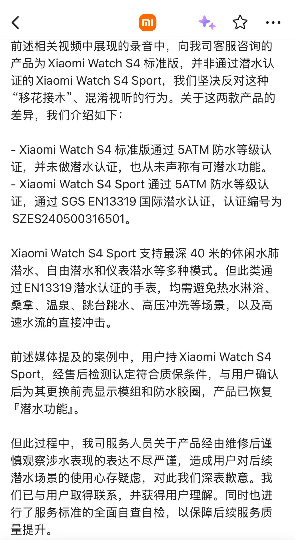 前述相关视频中展现的录音中,向我司客服咨询的产品为Xiaomi Watch S4标准版,并非通过潜水认证的Xiaomi Watch S4 Sport,我们坚决反对这种“移花接木”、混淆视听的行为。