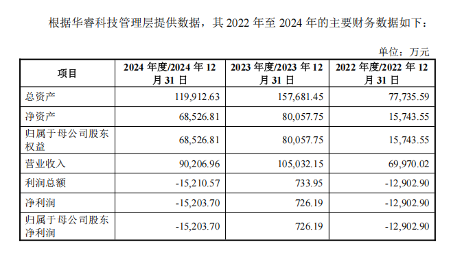 2024年,华睿科技实现营业收入9.02亿元,同比有所减少;归母净利润亏损1.52亿元。从2022年到2024年的3年中,华睿科技有两年都处于亏损状态,合计亏损约2.81亿元。