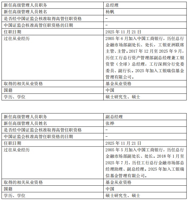 11月22日,工银瑞信基金发布公告称,杨帆自11月21日起出任工银瑞信基金总经理,张桦自11月21日起任该公司副总经理。相关事项已经该公司董事会审议通过,并已按规定完成监管备案。