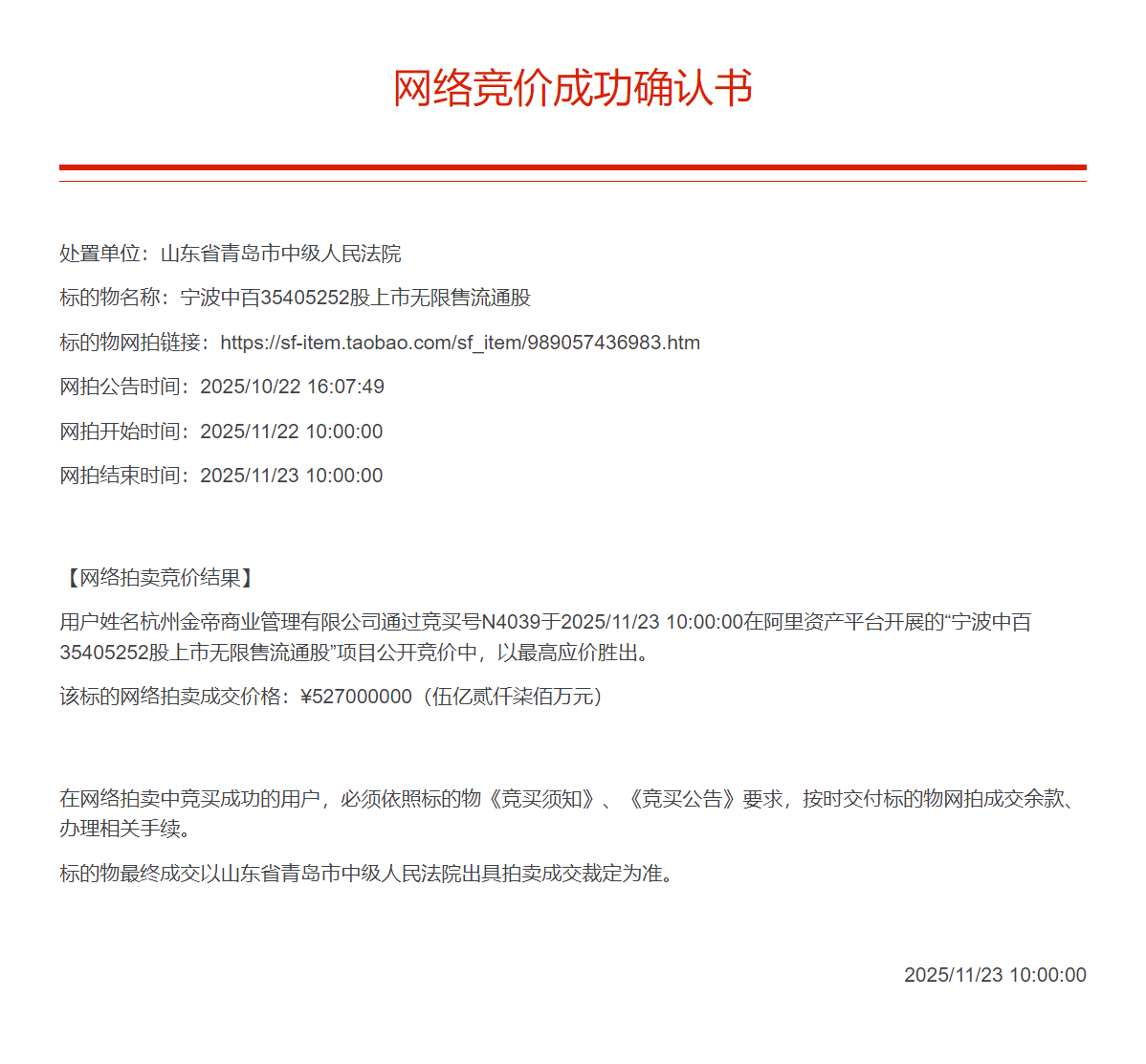 据阿里拍卖平台显示,11月23日,杭州金帝商业管理有限公司(以下简称“金帝商业”)以唯一竞买人身份,以一轮竞价摘得宁波中百大股东持有的3540.53万股股份,最终价格5.27亿元。