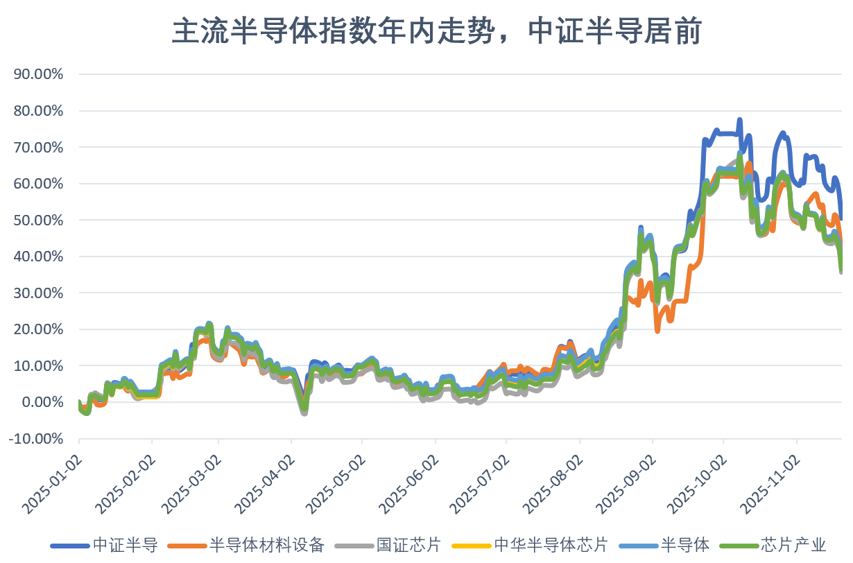 半导体设备ETF(561980)跟踪中证半导,截至11月21日,标的指数年内上涨43.72%,在31个申万一级行业中仅次于有色金属和通信;年内最大上涨幅度超过80%,对比国证芯片、中华半导体芯片、芯片产业同同类半导体类指数弹性居前。