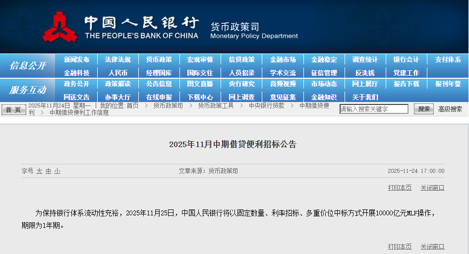 据中国人民银行官网信息,为保持银行体系流动性充裕,2025年11月25日,中国人民银行将以固定数量、利率招标、多重价位中标方式开展10000亿元MLF操作,期限为1年期。