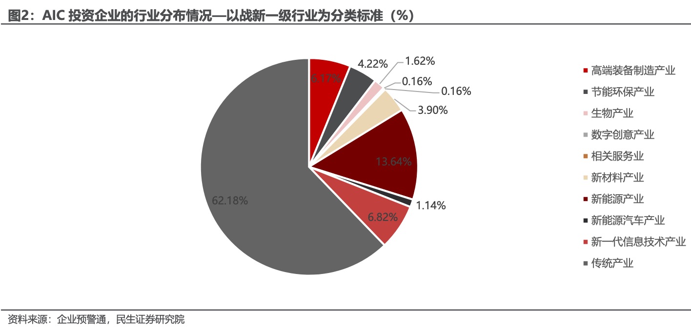 民生证券研报分析指出,从AIC重点投资的领域来看,以战新一级行业为分类标准,除了传统产业外,在战略性新兴产业方面,AIC投资的企业主要集中在新能源产业、新一代信息技术产业、高端装备制造产业等方向。