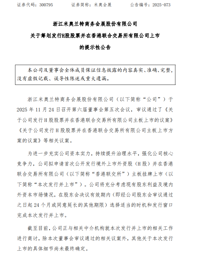 11月24日,米奥会展(300795.SZ)公告称,公司于2025年11月24日召开董事会审议通过相关议案,拟申请首次公开发行境外上市外资股(H股)并在香港联交所主板挂牌上市。公司将充分考虑现有股东利益及境内外资本市场情况,选择适当的时机和发行窗口完成本次发行并上市。目前,公司正与相关中介机构就本次发行并上市的相关工作进行商讨,其他具体细节尚未最终确定。
