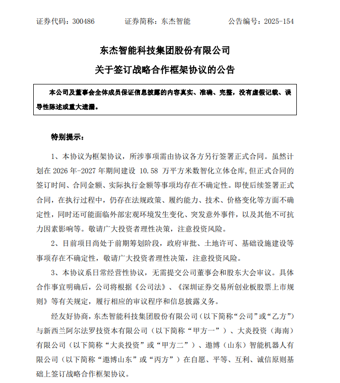 11月24日,东杰智能(300486.SZ)公告称,公司与新西兰阿尔法罗技资本有限公司、大炎投资(海南)有限公司、遨博(山东)智能机器人有限公司签订战略合作框架协议,计划在2026-2027年建设10.58万平方米数智化立体仓库,预算金额约为8.7亿元。