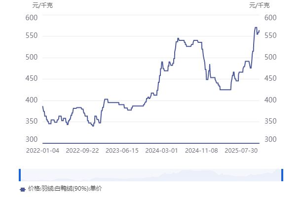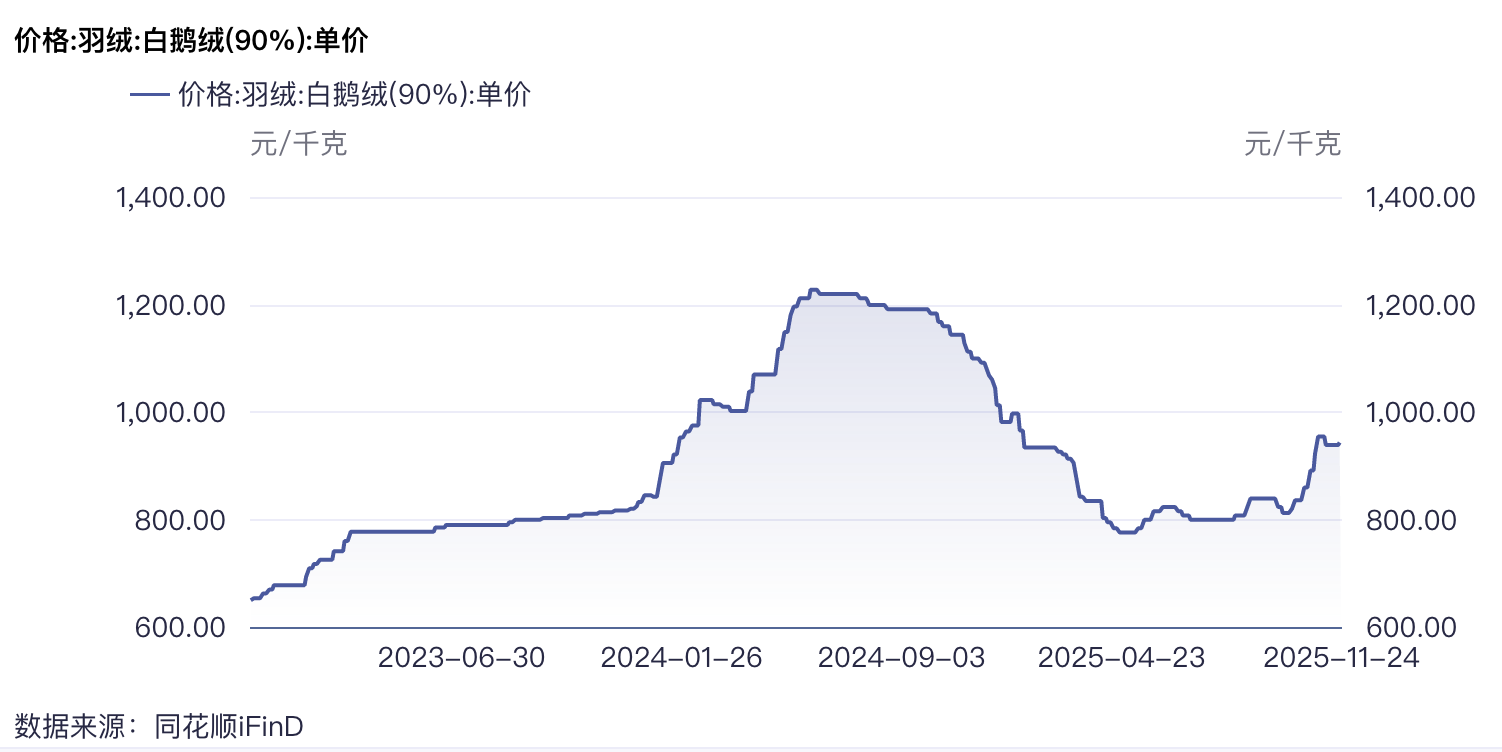 同花顺iFinD数据显示,90%白鸭绒价格达到近年高点。90%白鹅绒近年价格高点出现在2024年年中,近期尽管价格同比上涨,但未及当时高点水平。