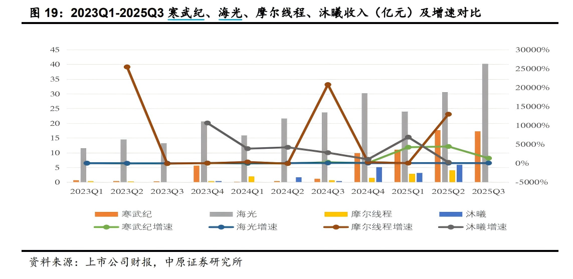 这一高增长趋势已在国产AI芯片厂商的业绩中得到显著印证。国内数据中心芯片厂商中,国产AI芯片厂商继2024年的收入高增长以后,2025年业务都呈现加速迹象。