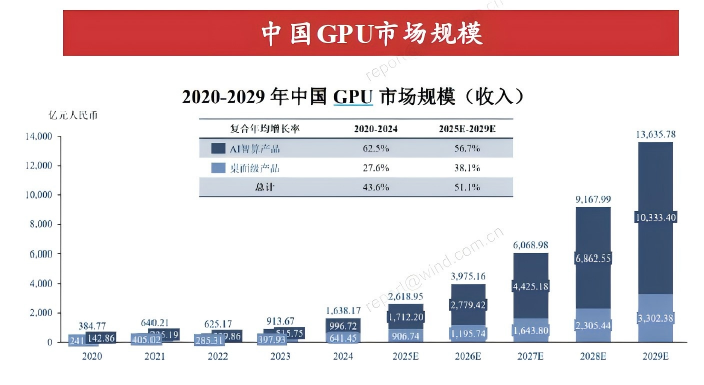 过去五年,中国GPU产业呈现快速增长态势,市场规模从2020年的384.77亿元快速增长到2024年的1638.17亿元。GPU产业下游应用领域可细分为AI智算产品和桌面级产品。未来,随着AI的应用不断开发,对于 GPU 等算力基础设施的需求预计将会出现爆发增长,预计到2029年中国 GPU市场规模将增长到13635.78亿元,在全球市场中的市场占比预计将从2024年的15.6%提升至2029年的37.8%。(来源:中信建投,2025年11月16日,《2025年11月第2周新股概览:摩尔线程询价在即,沐曦股份完成注册月第2周新股概览》。
