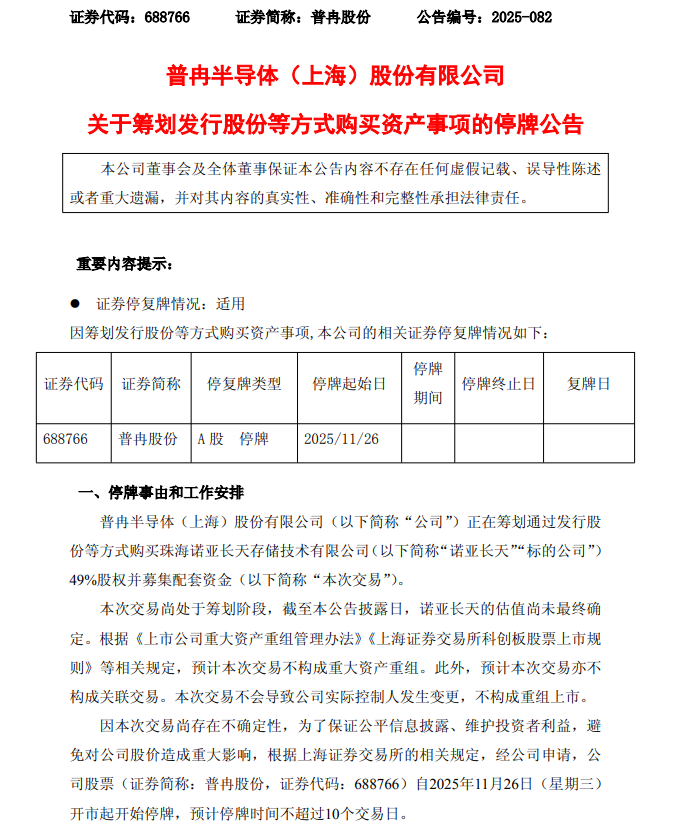 11月25日,普冉股份(688766.SH)公告称,公司正在筹划通过发行股份等方式购买珠海诺亚长天存储技术有限公司49%股权并募集配套资金。本次交易尚处于筹划阶段,预计不构成重大资产重组,也不构成关联交易。公司股票自2025年11月26日起停牌,预计停牌时间不超过10个交易日。