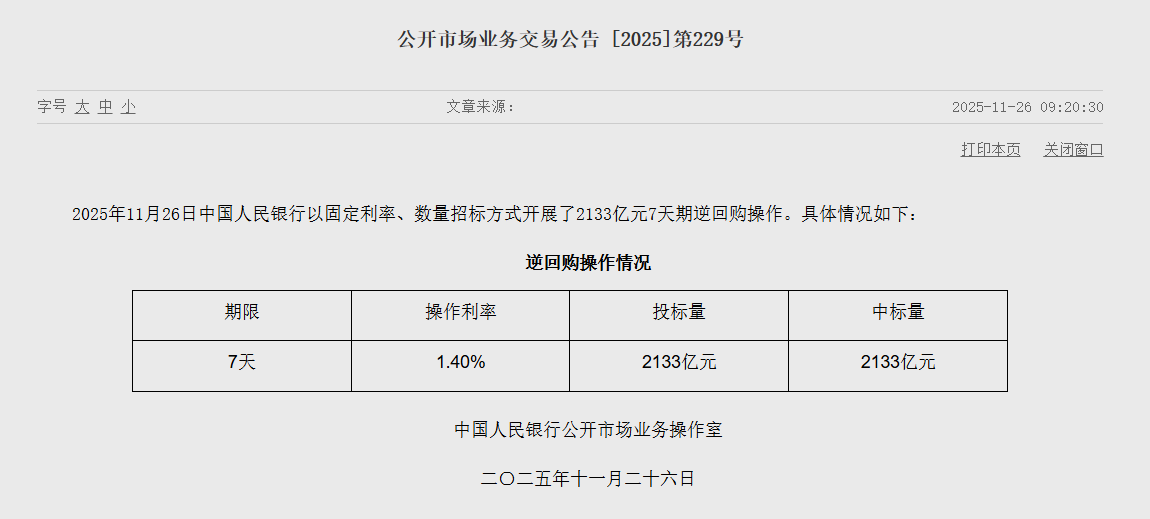 央行今日开展2133亿元7天期逆回购 财闻 2025-11-26 10:35:00 11月26日,央行以固定利率、数量招标方式开展了2133亿元7天期逆回购操作,操作利率1.40%。 2025年11月26日,中国人民银行以固定利率、数量招标方式开展了2133亿元7天期逆回购操作,操作利率1.40%。