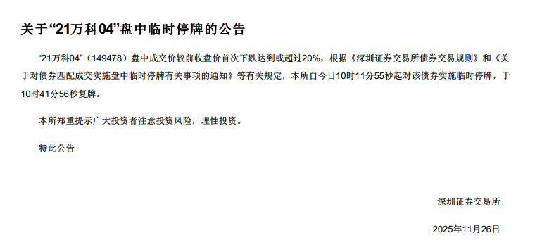 11月26日盘中,深交所公告,“21万科04”(149478)盘中成交价较前收盘价首次下跌达到或超过20%,根据有关规定,本所自今日10时11分55秒起对该债券实施临时停牌,于10时41分56秒复牌。