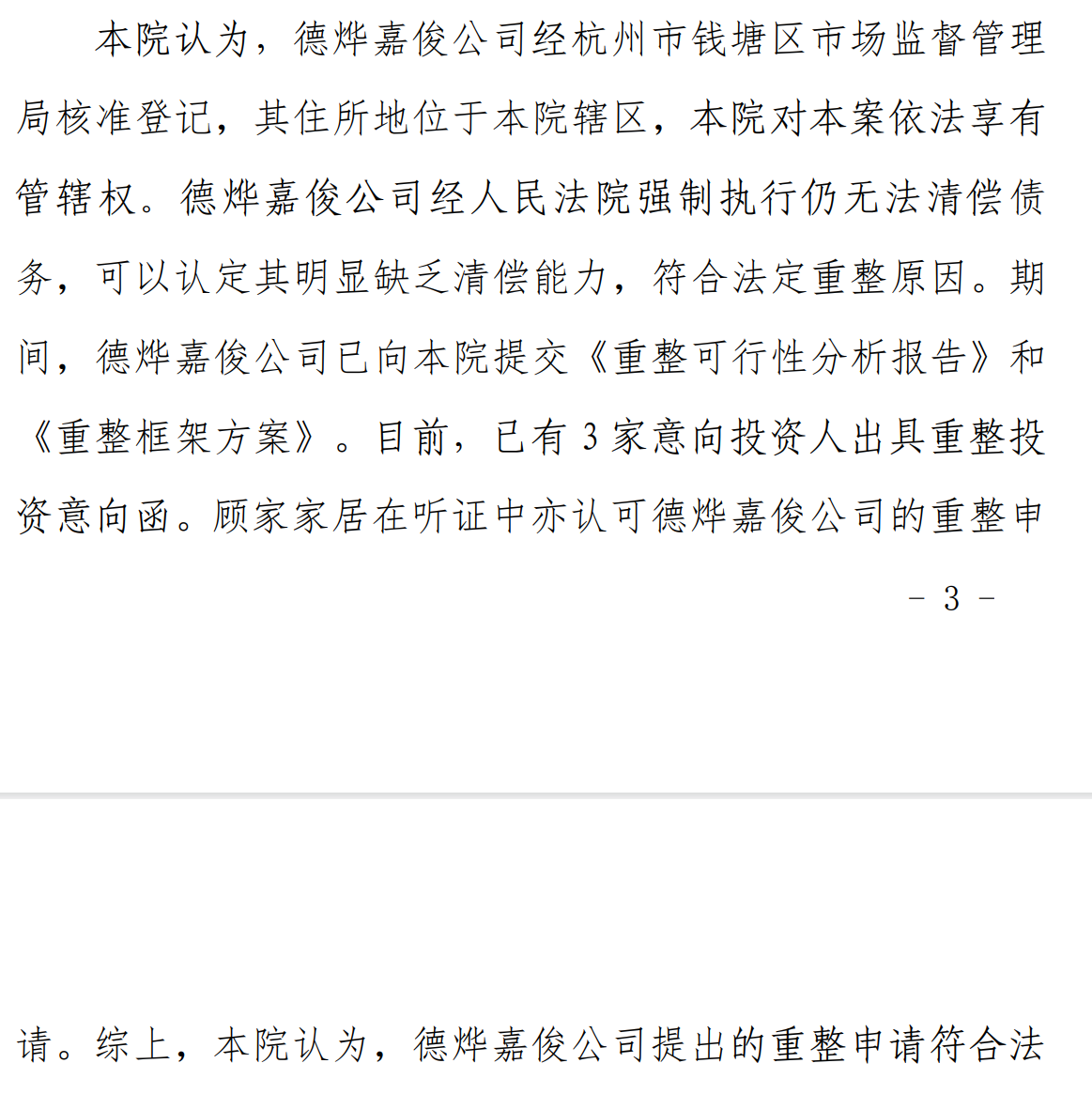 法院表示,顾家集团在被执行案件中多次因“无财产可供执行”而被终结执行,符合法定重整条件。目前有三家机构提交重整投资意向函。顾家家居未反对重整申请。