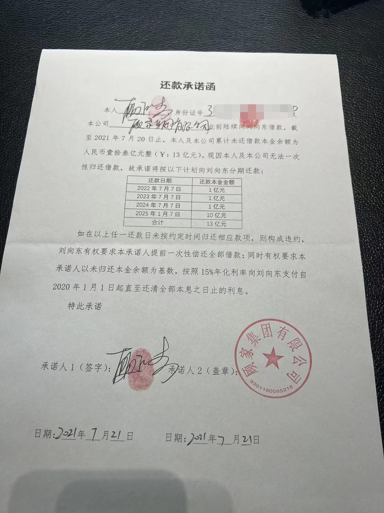 除资产转移指控外,代明贸易还提供文件称,顾江生多年向民间放贷人刘向东举债。一份2021年签署的承诺书显示,当年借款余额约13亿元,偿付期至2025年。