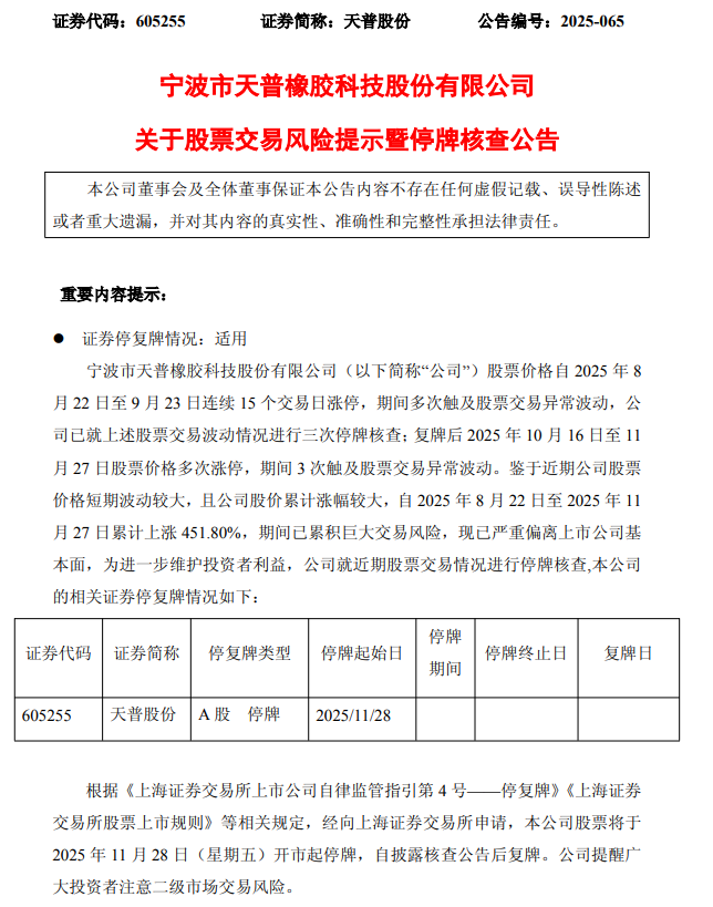 11月27日晚间,天普股份(605255.SH)公告称,公司股票价格自2025年8月22日至9月23日连续15个交易日涨停,期间多次触及股票交易异常波动,公司已就上述股票交易波动情况进行三次停牌核查;复牌后2025年10月16日至11月27日股票价格多次涨停,期间3次触及股票交易异常波动。