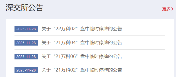 11月28日,深交所公告,“21万科02”(149358)盘中成交价较前收盘价首次下跌达到或超过20%,根据《深圳证券交易所债券交易规则》和《关于对债券匹配成交实施盘中临时停牌有关事项的通知》等有关规定,本所自今日09时30分25秒起对该债券实施临时停牌,于10时00分26秒复牌。