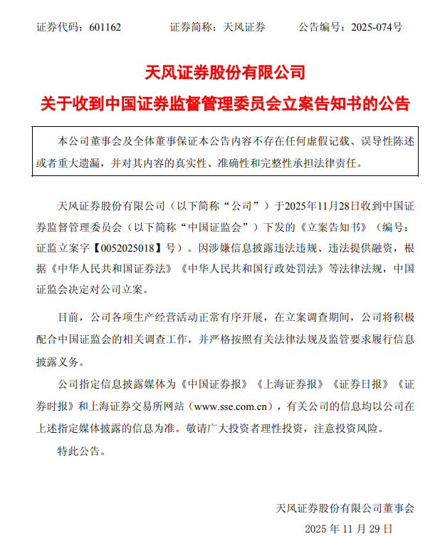 11月28日,天风证券(601162.SH)公告称,公司于2025年11月28日收到中国证监会下发的《立案告知书》,因涉嫌信息披露违法违规、违法提供融资,中国证监会决定对公司立案。目前,公司各项生产经营活动正常有序开展,在立案调查期间,公司将积极配合中国证监会的相关调查工作,并严格按照有关法律法规及监管要求履行信息披露义务。