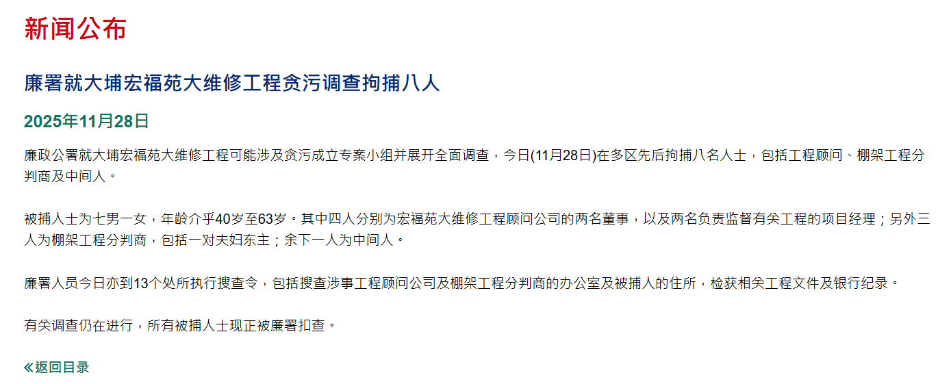 11月28日,香港廉政公署发布新闻稿称,廉政公署就大埔宏福苑维修工程可能涉及贪污成立专案小组并展开全面调查,今日(11月28日)在多区先后拘捕8人,包括工程顾问、棚架工程分包商及中间人。