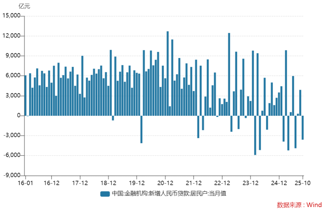 最后是新动能和旧动能之间的分化。房地产开发投资目前正以15%的跌幅收缩,同时大中城市的房价依然在下跌,旧动能的持续收缩已经持续了将近4年,带来了地方政府的财政紧平衡压力,也带来了金融市场上的“资产荒”压力,还带来了居民部门的资产负债收缩压力。从居民部门月度的新增贷款数据来看,居民部门仍处于去杠杆过程中。