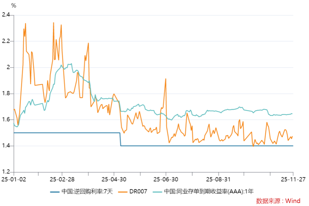 货币政策这两年出现了操作机制上的显著调整。2024年7月央行淡化中期借贷便利(MLF)的政策利率作用,7天逆回购正式成为基准的政策利率,这一方面说明利率市场化任务完成不错,央行认为只要调节短期政策利率,其他资金利率和中长期利率可以按照市场逻辑自行加点传导,另一方面也说明政策利率的中枢从2%左右来到1.4%左右,引导实体经济和债券市场的付息成本持续下行。