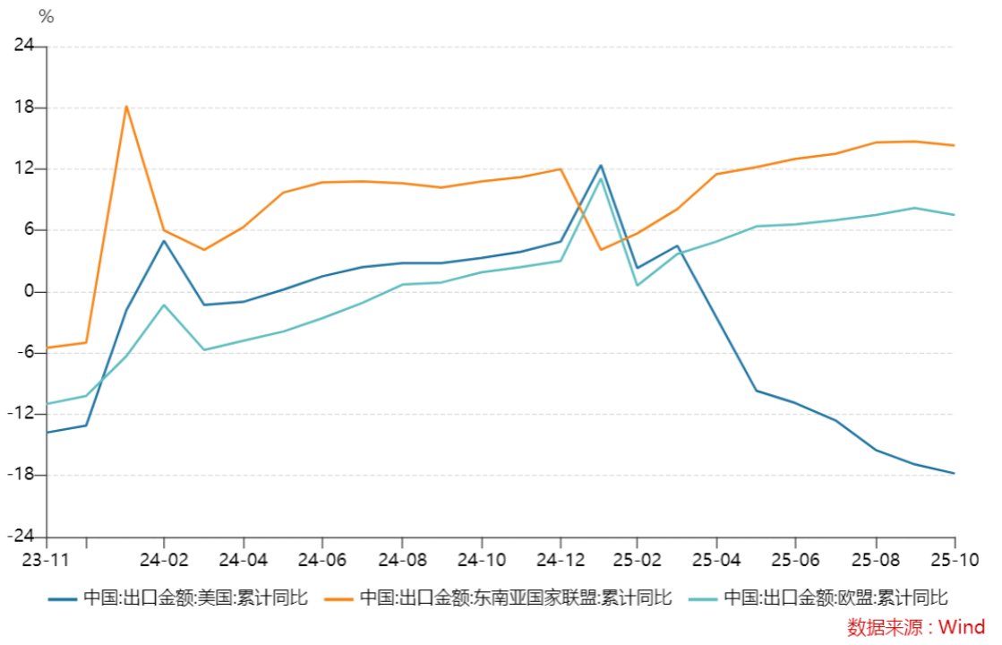 一方面是外需的韧性。美国与欧洲在所谓对华“去风险”方面达成共识,近年来在高技术产品领域持续对我国的进出口进行干扰,2021年以来我国高技术产品的进出口金额总体是走低的。另一方面是美国挑起了所谓“对等关税”的极端贸易冲突,并且对我国的转出口进行围堵,2025年我国向美国的出口金额或大幅收缩20%左右。