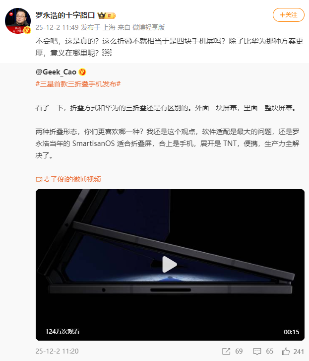 一向爱锐评的罗永浩在微博转发相关话题时发问:“不会吧,这是真的?这么折叠不就相当于是四块手机屏吗?除了比华为那种方案更厚,意义在哪里呢?”