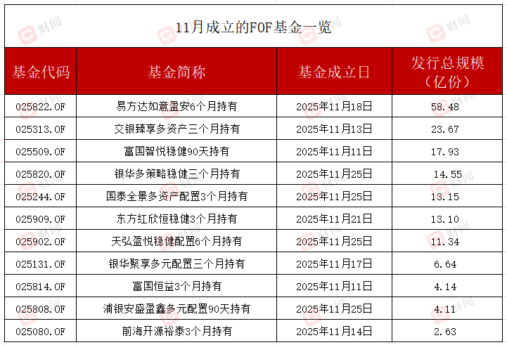 在11月成立的基金中,易方达如意盈安6个月持有(FOF)以58.48亿元的募集规模,成为当月发行规模最大的产品。