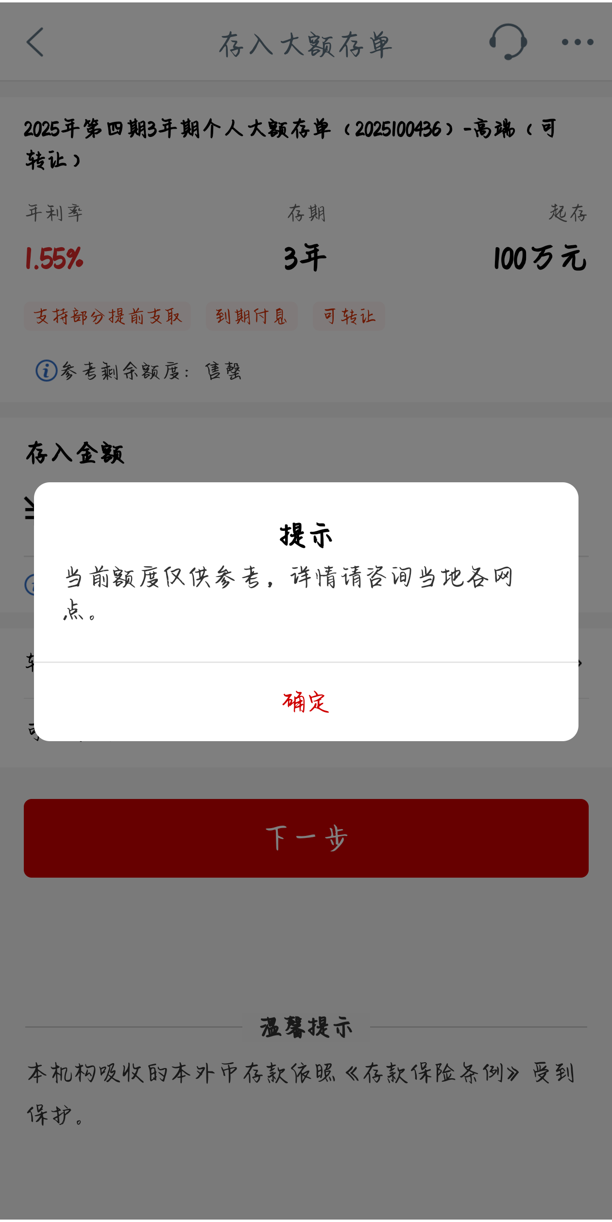 12月3日,工商银行(601398.SH)APP显示,该行正在发售的2025年第四期3年期个人大额存单(2025100436)-高端(可转让)已售罄。该大额存单起步门槛标注为“100万起存”,而年利率仅为1.55%。而同等收益率的“20万起存”3年期个人大额存单参考剩余额度大于1000万。