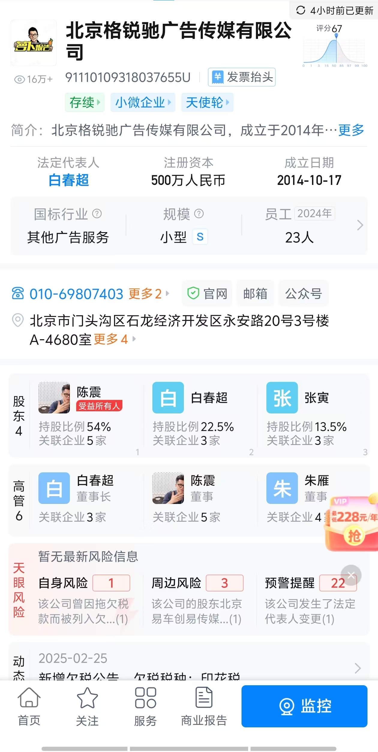 天眼查数据显示,陈震目前续存的关联企业共计四家,直接持股54%的北京格锐驰广告传媒有限公司成立于2014年,2025年10月,北京市门头沟区税务局发布消息,该公司存在欠税金额2965.14万元,税种为印花税。