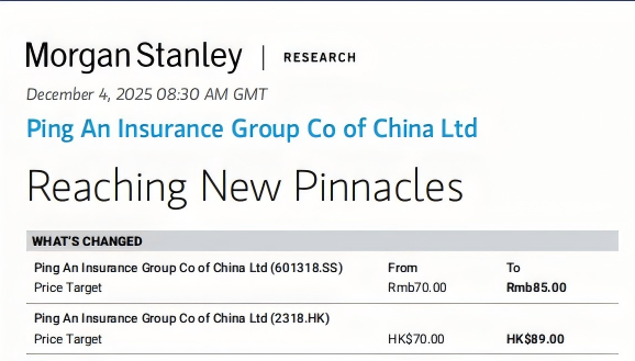 在这份最新研报中,摩根士丹利称中国平安“正迈向新的辉煌”,给予“增持”,并将中国平安A股目标价从70元上调至85元,H股目标价从70港元上调至89港元。