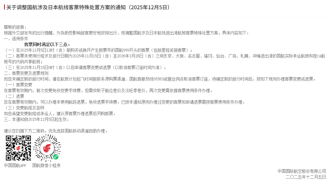 国航在通知中明确,对于在2025年12月5日12时(含)前购买或换开产生新票号的国航999开头的客票(包括里程奖励客票);客票未使用行程涉及旅行日期为2025年11月15日(含)至2026年3月28日(含)之间东京、大阪、名古屋、福冈、仙台、广岛、札幌、冲绳进出港的国航实际承运航班和挂CA航班号的代码共享航班;在2025年11月15日0时(含)以后申请客票变更或退票的这三种情况,首次变更免收变更手续费,退票也免收手续费。