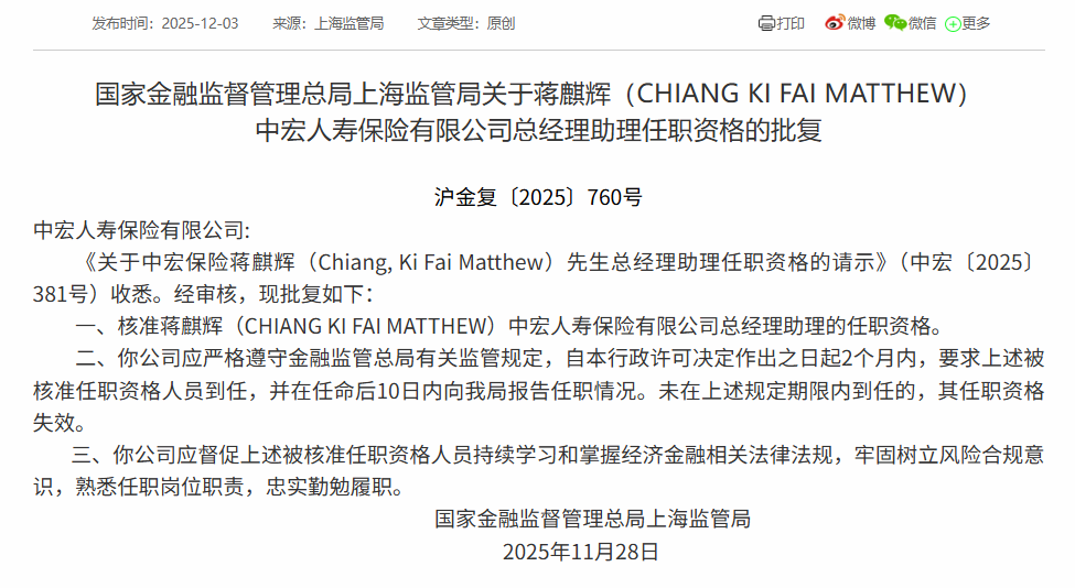 国家金融监督管理总局上海监管局近日发布的批复信息显示,核准蒋麒辉(CHIANG KI FAI MATTHEW)中宏人寿保险有限公司总经理助理的任职资格。