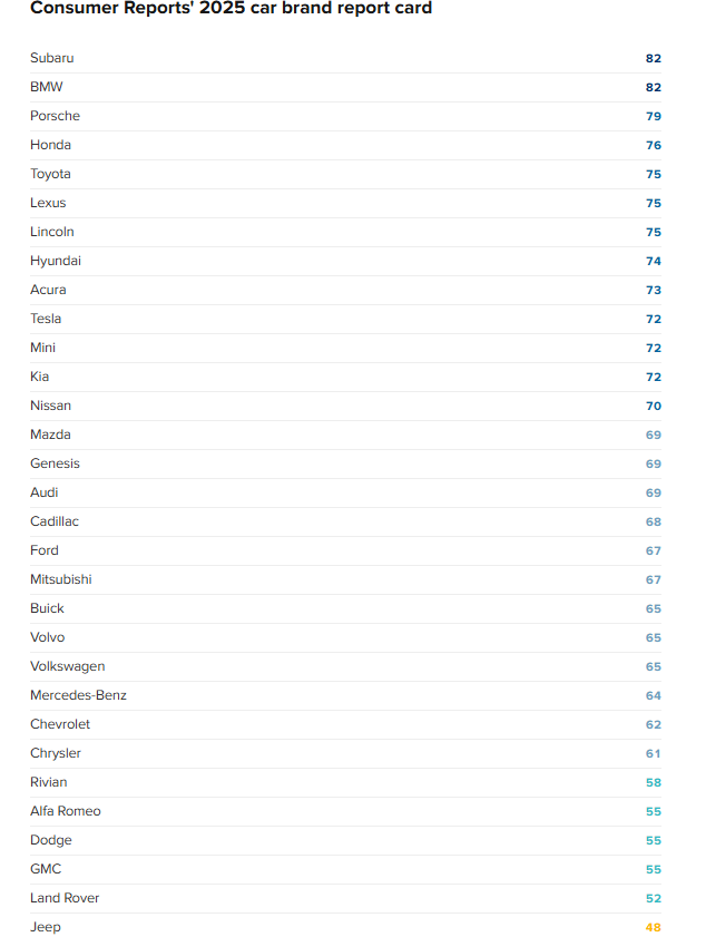 此外,根据《消费者报告》,斯巴鲁位居2026年整体品牌榜首,宝马、保时捷、本田(HMC.US)和丰田依次进入前五名。排名垫底的是吉普、路虎、GMC、道奇和阿尔法·罗密欧。
