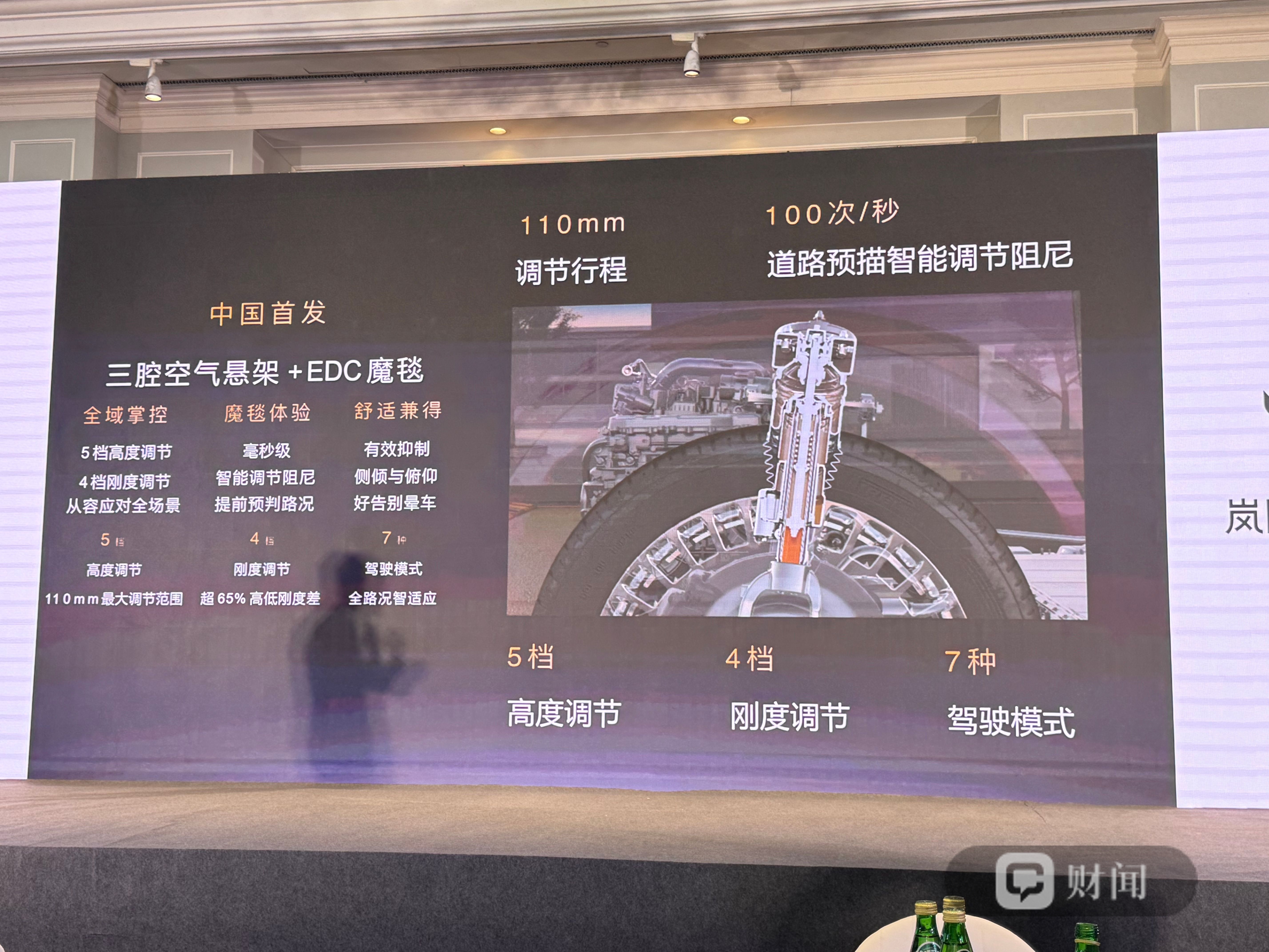虽然试驾路段是城市的铺装路面,但难免也有一些起伏和不平整的情况,这款车的核心卖点三腔空气悬架有了发挥空间。三腔空悬的优势,能实现更细腻的悬架调节,空气弹簧有三个独立气室,搭配EDC魔毯功能,可根据不同路况切换软硬度和高低,重点强调一个“稳”字。