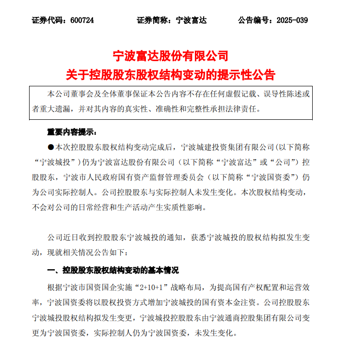 宁波富达:宁波城投控股股东拟变更为宁波国资委