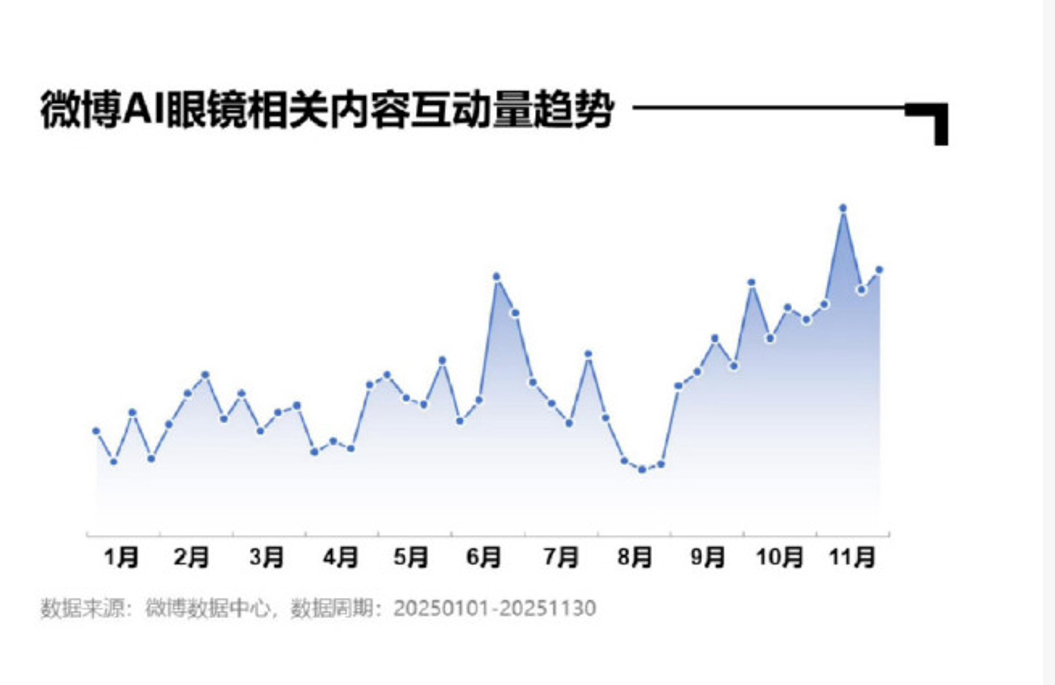 微博数据显示,AI眼镜相关内容互动量在2025年持续攀升,互动量从年初至11月末实现翻倍增长。