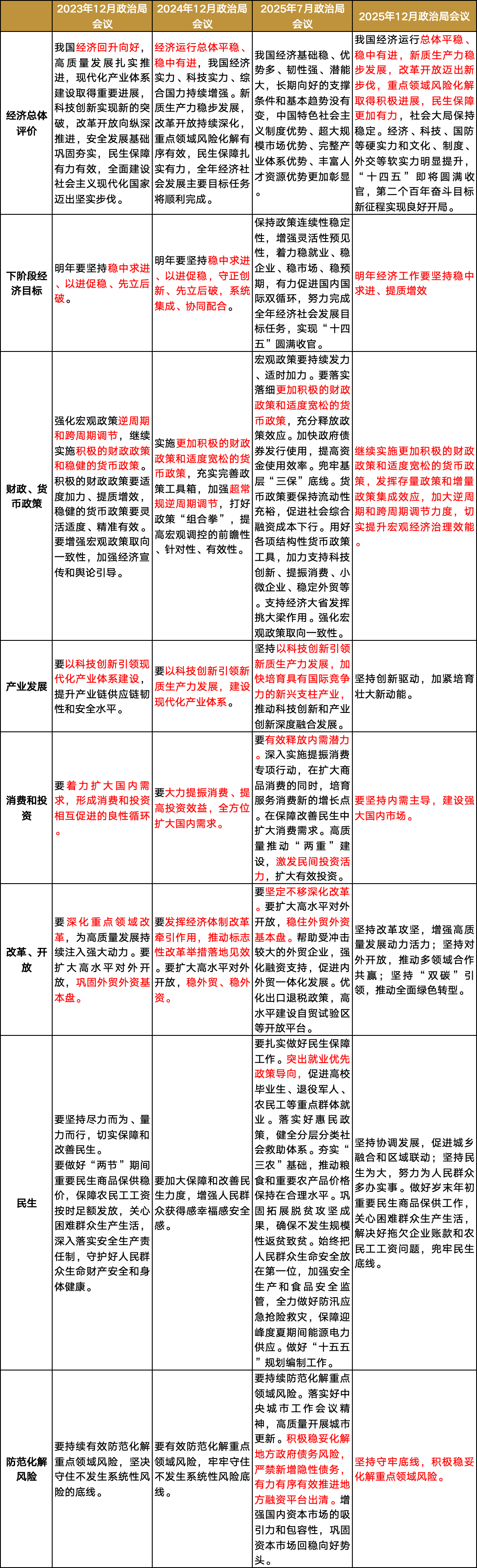 附:2023年、2024年12月,2025年7月以及2025年12月政治局会议内容对比