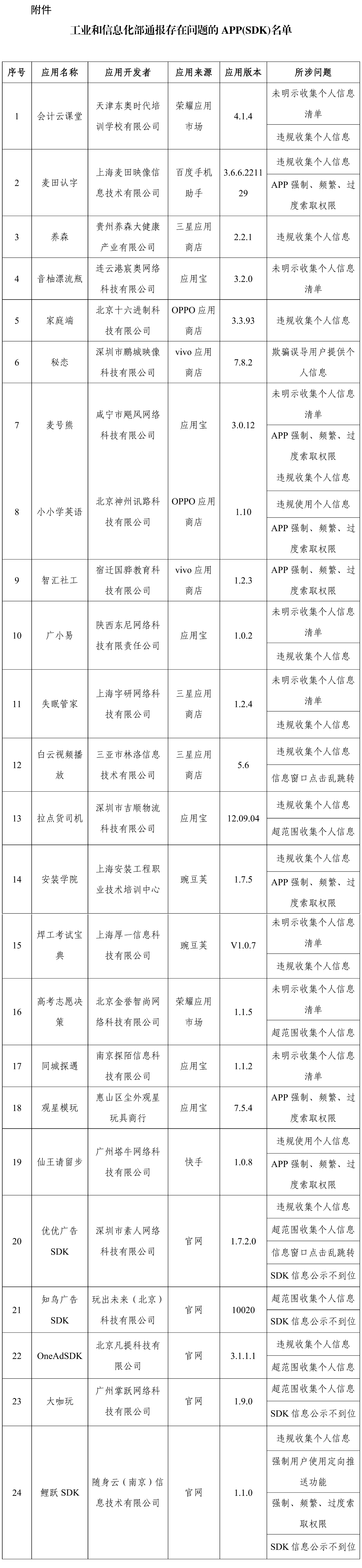 附件:工业和信息化部通报存在问题的APP(SDK)名单